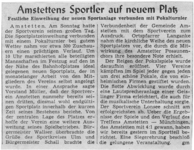 Spielbericht: Hans Hiller stand nicht zur Verfügung, da er am Samstag und Sonntag arbeiten musste. Auf OttoWittmann wurde verzichtet, da seine Frau bislang krank war und gegen Neenstetten sowieso gewonnen werden musste. Torschützen: Ilg Hans, Stech Fritz, Steinhübel Leo. Ergebnis: 3:1 für Amstetten Halbzeit 1:1
